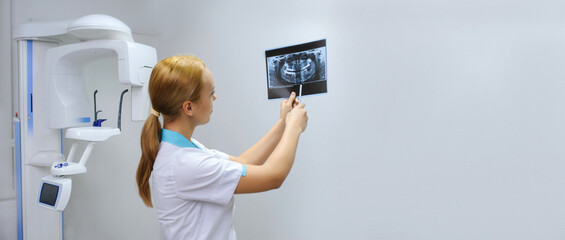 Young woman making panoramic shot of the jaw holding her face at the x-ray machine