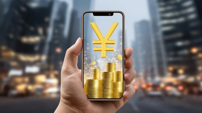 A hand holds a smartphone displaying the digital yuan symbol and golden coins, symbolizing progress in financial transactions in an urban setting