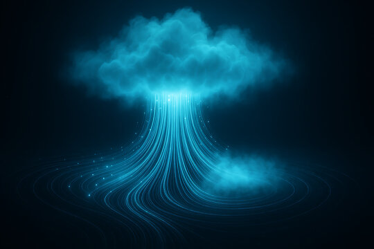 Futuristic glowing cloud raining streams of digital data light, neon blue network cloud computing concept, cyber technology rain, virtual storage, high tech information flow, abstract sci fi holograph