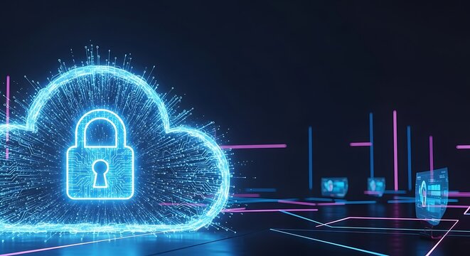 Secure digital cloud with glowing padlock icon and futuristic data streams, representing cybersecurity and network protection