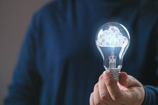 A person holding a glowing light bulb with a digital cloud icon inside, symbolizing cloud computing, innovation, technology, creativity, and smart ideas in modern digital transformation concepts.
