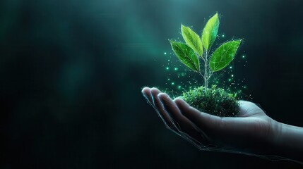 A hand delicately holds a small plant against a dark background, with digital effects giving a futuristic appearance. The glowing leaves suggest growth and potential.