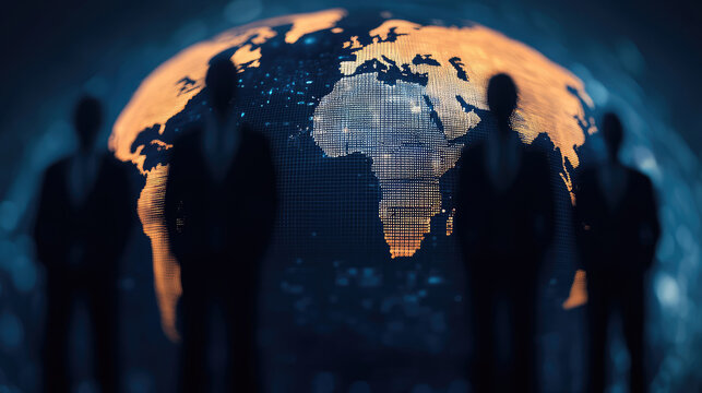 Business leaders stand in front of digital globe, symbolizing global connections and leadership in modern world. image conveys sense of unity and progress