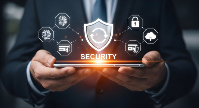 A professional authenticates with a digital fingerprint interface, representing cybersecurity, secure access, identity verification, data protection, and advanced business security systems.