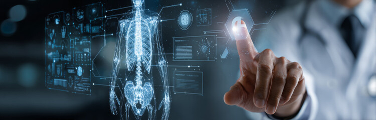 High-tech medical technology concept with a doctor interacting with a digital interface displaying a detailed 3d human skeletal and internal organ system for advanced healthcare