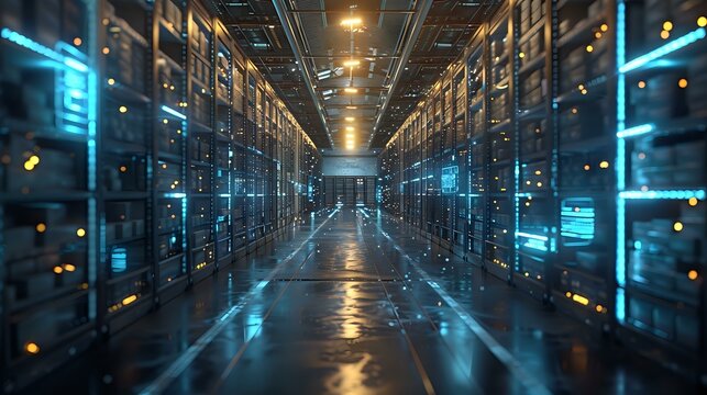 Server racks displaying data analytics overlays in modern data center