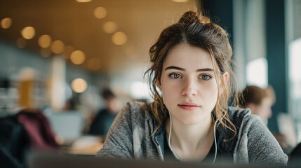 Close-up portrait of a young student using a laptop in a modern library, with natural light from large windows. Focused expression, realistic details, atmosphere of learning and concentration
