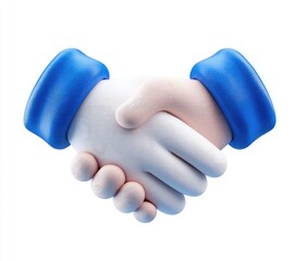 Cartoonish handshake, light beige and blue hands clasped, digitally rendered, isolated on white background