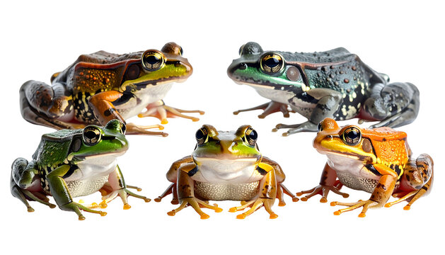 Close-up of six frogs, diverse colors and patterns, set against a transparent background