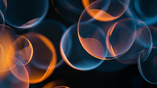 black screen with orange and blue circles, realistic usage of light and color, fine lines, delicate curves, dark blue and light amber, rounded forms, digitally enhanced