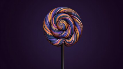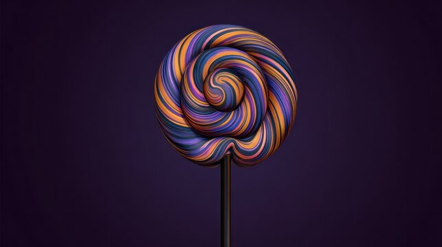 A digitally rendered, vibrant lollipop with a swirling pattern of orange, purple, and blue stripes on a dark background, mounted on a black stick