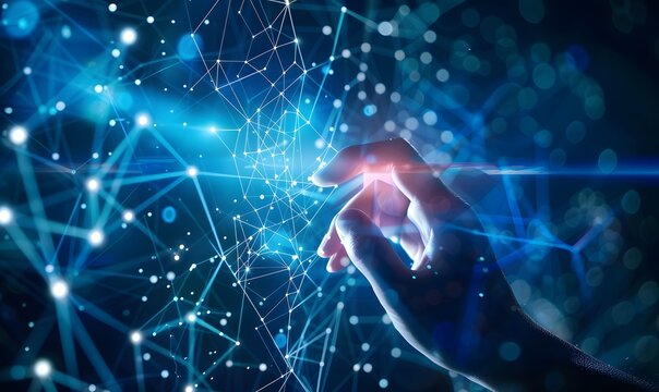 Cybernetic digital background with glowing grid lines and neon lights in a futuristic technological landscape with abstract network connections