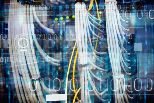 Servers and digital clouds overlaid on binary coding