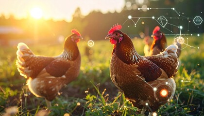 Image of data processing over hens outdoors. animals and digital interface concept digitally generated image.