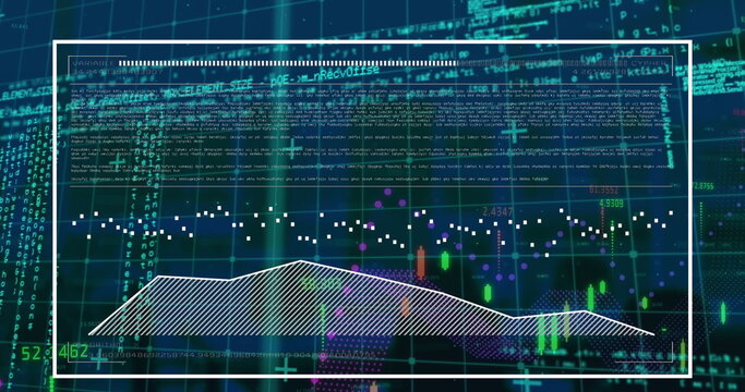 Image of circles on lines of graph over grid pattern and computer language against globe