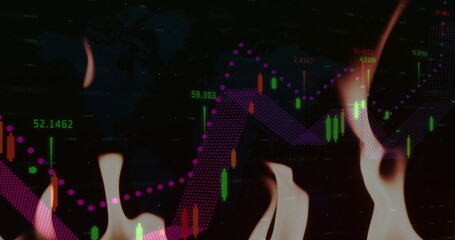 Image of graphs with changing numbers over computer language and globe on abstract background