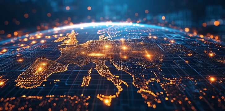 Europe Glowing Network Visualization with City Lights and Data Connection