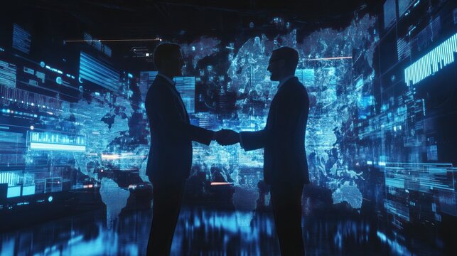 Two businessmen's silhouettes shaking hands digitally
