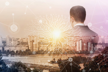 A team of engineers collaborating in a virtual environment using smart technology to digitally plan and simulate construction processes before implementation in the physical world.
