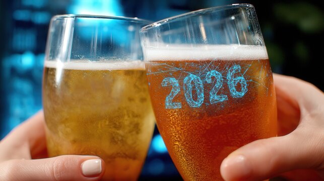 Scientists and engineers celebrate 2026 with virtual hologram glasses in a sleek tech lab, surrounded by robotics, glowing lights and futuristic energy.