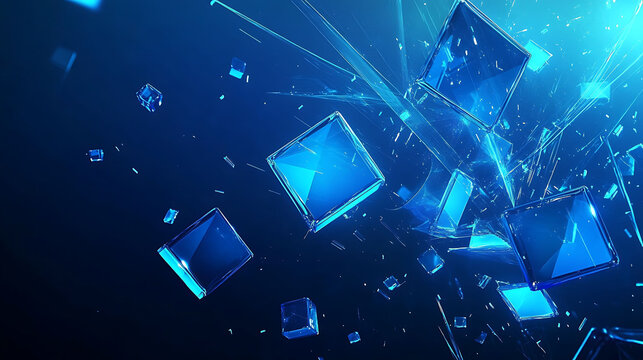A digital abstract scene with transparent blue cubes, triangular shapes, and glowing lines in bright cyan, suspended over a deep blue background that fades into darkness,