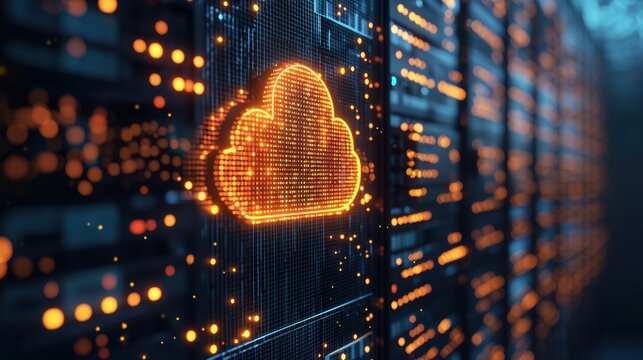 Futuristic digital cloud icon on a high-tech server grid representing cloud computing technology