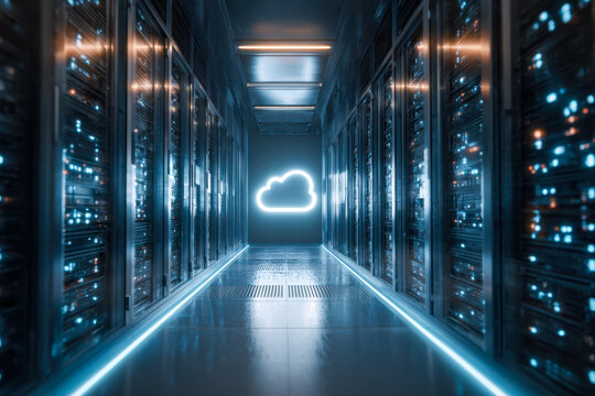 Futuristic data center hallway with a glowing cloud symbol representing cloud storage
