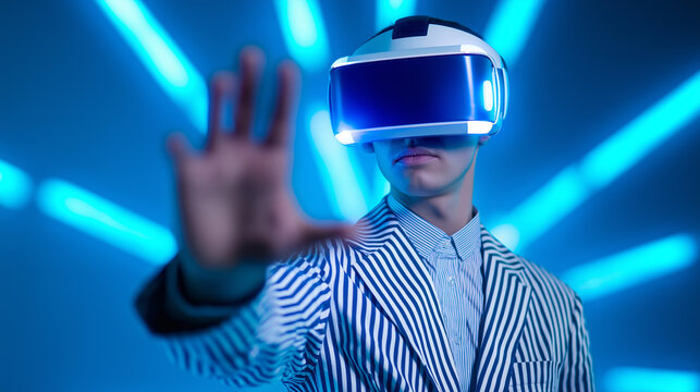 Stylish man in a striped blazer using a VR headset in a futuristic blue-lit environment.