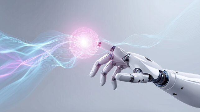 Robotic hand interacting with a glowing digital energy sphere representing artificial intelligence, innovation, and advanced data interaction.