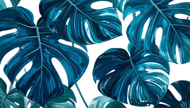 An illustrated pattern featuring daisy-like flowers with white petals and yellow centers, surrounded by green leaves and small buds, set on a blue background