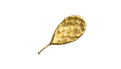 A stylized golden leaf against a stark black background, showcasing intricate texture