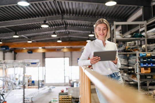 Smiling young woman using tablet in a factory