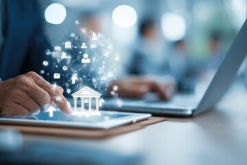 Hands typing on a laptop with a digital bank icon