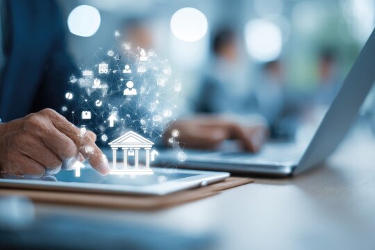Close-up of hands on tablet, bank icon, digital interface