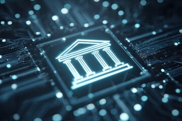 A glowing, white icon of a classical building, likely a bank or government structure, is centered on a dark backdrop of intricate circuit board pathways.  The icon is outlined in a transparent box.