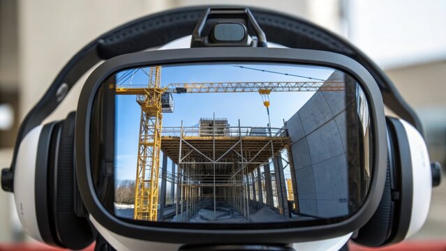 An immersive VR scenario displayed on a headset showing a digitized construction site. The view captures the intricate details of a virtual crane and scaffolding while the