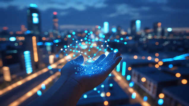 Modern city and digital technology concept. Wide angle visual for banners or advertisements.
