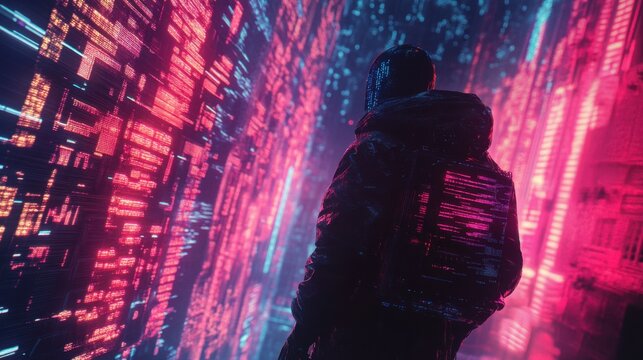 Neon circle overlaying digital binary code screen