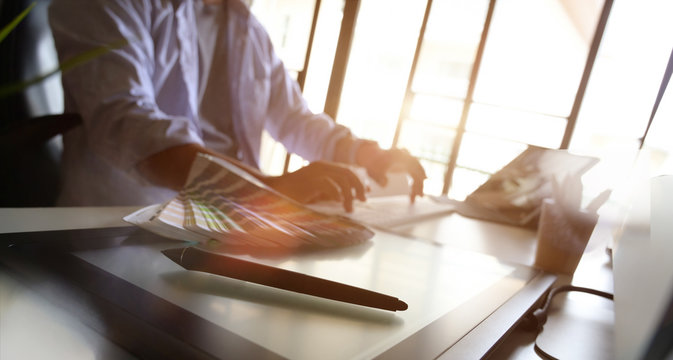 Creative professional working at modern desk with digital tablet