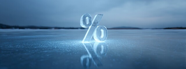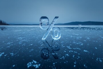 Transparent ice percent symbol on frozen lake. Concept of cold economy, interest rates, winter finance, frozen assets, risk.
