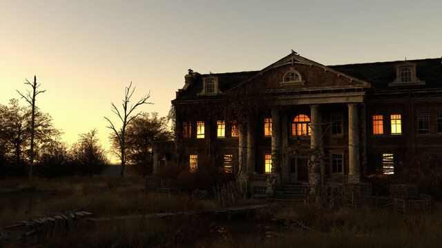 Ominous dilapidated and abandoned mansion with illuminated interior lighting at dusk. 3D rendering.