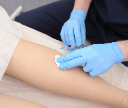 The doctor injects a syringe under the knee. A doctor makes an injection to the varicose veins on a woman s leg, close-up, sclerotherapy, stripping, phlebeurysm, medical.