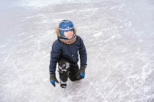 cute caucasian preschooler boy learn to skate on ice rink. Kid wearing winter jacket, hood hat and neckwarmer standing on one knee. Image with selective focus