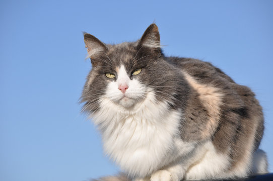 Beautiful long haired diluted calico cat against blue skies on a cold winter day
