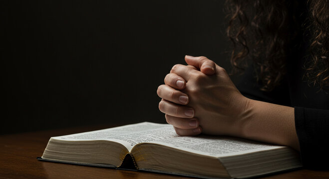 Woman s hands clasped in prayer over an open bible in dim light