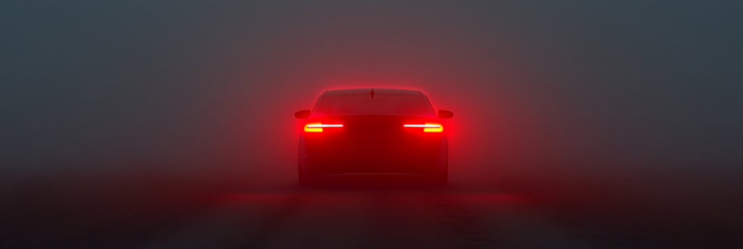 The red taillights of a modern sports car reflect on a wet highway during a heavy rainstorm at night. A cinematic automotive render.