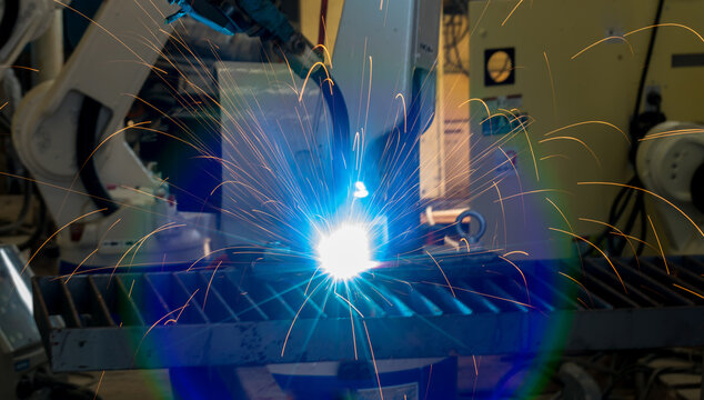 Welding robots movement in factory. Sparks during electric welding. The dim large factory robotic arm is being welded and assembled
