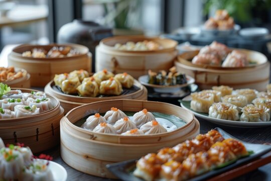 Assorted Dim Sum Delights in Traditional Bamboo Steaming Baskets