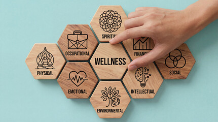 Hand placing the 'Wellness' tile at the center of eight interconnected hexagonal blocks representing the comprehensive dimensions of holistic health and well-being
