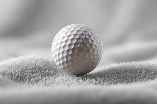 Monochrome golf ball resting on grass, showcasing intricate dimple pattern and serene, minimalist sporting aesthetic in grayscale.